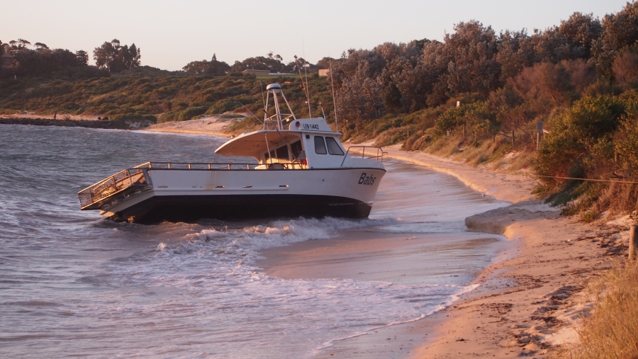 Fishing boat blown off its moorings by a south-westerly; aground on Frenchmans Beach, August 2017