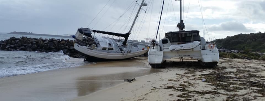 Sloop and catamaran blown off their moorings by a south-westerly; aground on Frenchmans Beach, 5 June 2019. Image courtesy Cheryl Rennie